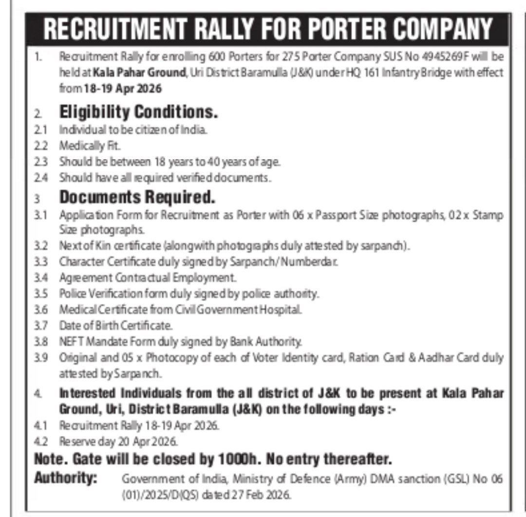 army porter bharti 2026: rally addressopen rally address-; “Kala Pahar Ground, Uri, District Baramulla, Jammu & Kashmir (J&K)“ ⚠️ Note: J&K ke sabhi districts se interested candidates is address par 18-19 April 2026 ko pahunch sakte hain. Gate subah 10 baje band ho jayega.