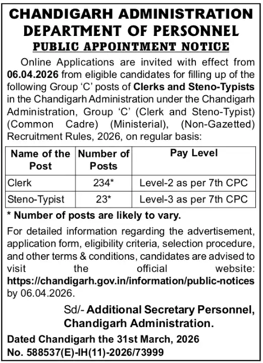 answer: Chandigarh Administration Clerk Recruitment 2026 is an official recruitment drive that offers 257 total vacancies including 234 Clerk posts and 23 Steno Typist posts under Group ‘C’ category on a regular basis.